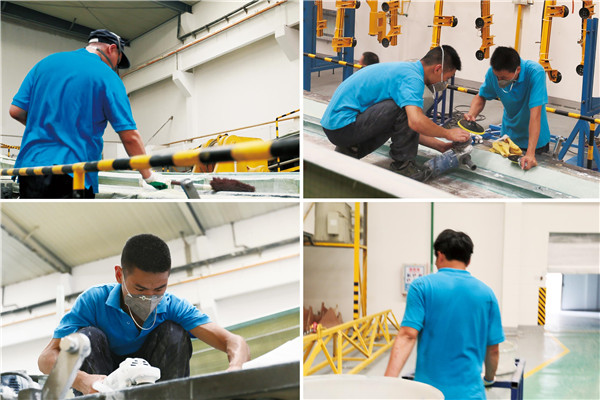 但這個(gè)“收拾”卻用了近半小時(shí),這是工人們與自己較勁的半小時(shí),檢查并確保每一項(xiàng)工作、每一個(gè)細(xì)節(jié)都暫停無(wú)誤才離開(kāi)崗位;而這種“較勁”精神如同浸透衣衫帽檐的汗水,被滿滿傾注在每道工序里,模具處理、殼體鋪層、殼體注膠、殼體固化、殼體清理、合模、補(bǔ)強(qiáng)、葉片表面處理……