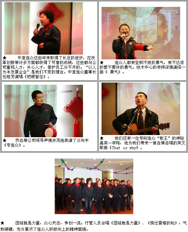 在主持人的優(yōu)美的開場(chǎng)白后,中復(fù)連眾2007年元旦聯(lián)歡會(huì)揭開了序幕。聯(lián)歡會(huì)的節(jié)目五彩繽紛,驚喜連連,下面分別是這次聯(lián)歡會(huì)的精彩片斷: