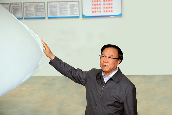 隨后,陸浩、徐守盛等各位領(lǐng)導(dǎo)和嘉賓相繼視察了包括中復(fù)、華銳、金風(fēng)科技的幾個(gè)酒泉產(chǎn)業(yè)化基地的風(fēng)電企業(yè)。在來(lái)到中國(guó)復(fù)材3兆瓦的葉片車(chē)間之后,陸浩認(rèn)真聽(tīng)取了張定金的介紹匯報(bào),當(dāng)看到中復(fù)生產(chǎn)的3兆瓦葉片時(shí)非常高興,并與其他領(lǐng)導(dǎo)和嘉賓一起出席中復(fù)3.0MW風(fēng)力機(jī)葉片的投產(chǎn)儀式,中國(guó)復(fù)材副總經(jīng)理、中復(fù)連眾集團(tuán)董事長(zhǎng)任桂芳、總經(jīng)理喬光輝陪同參觀(guān)。